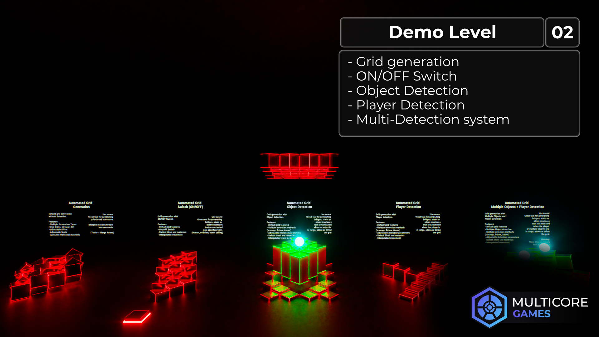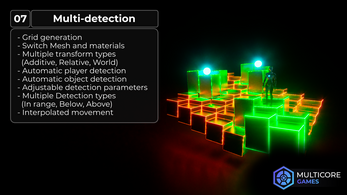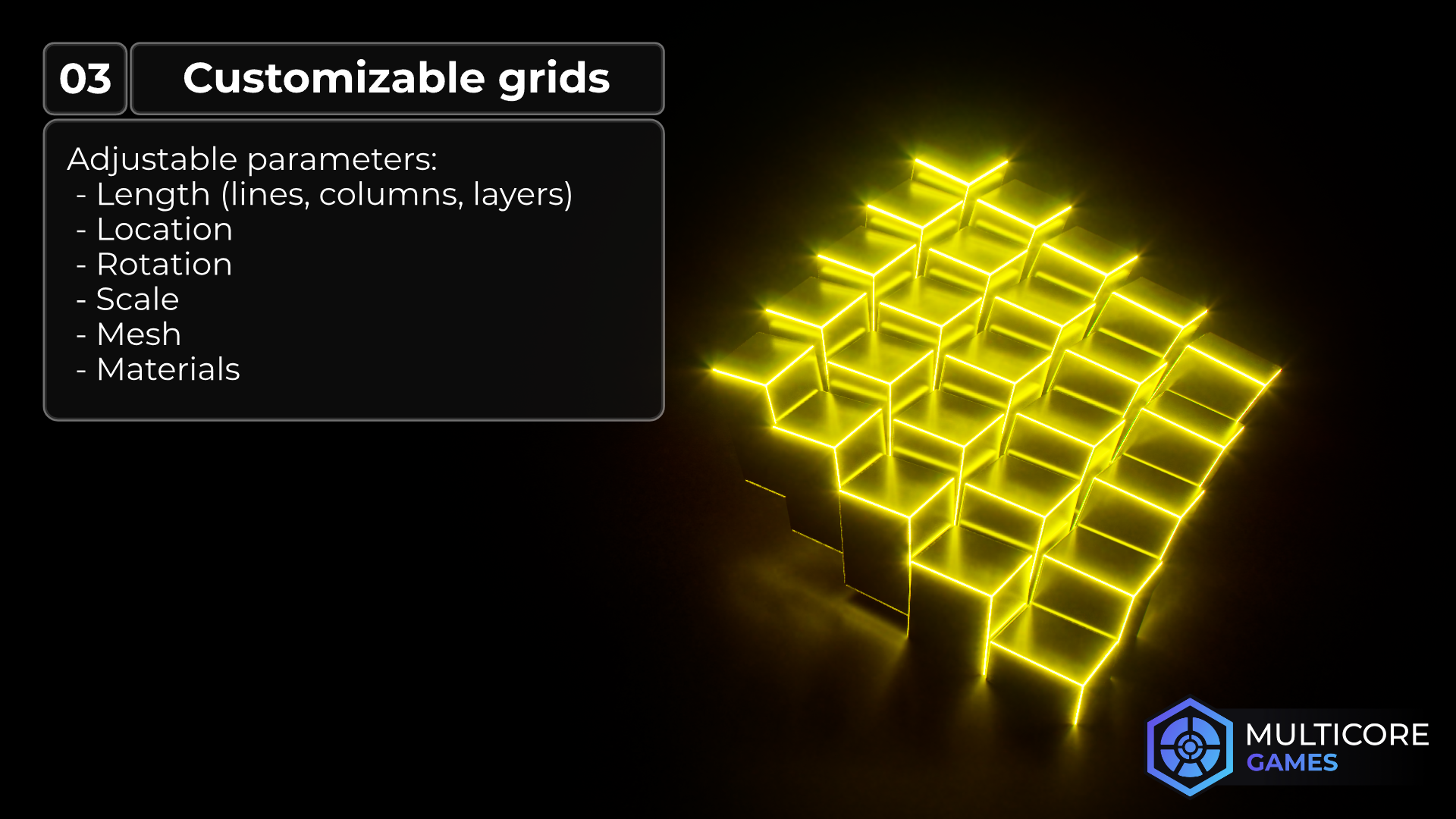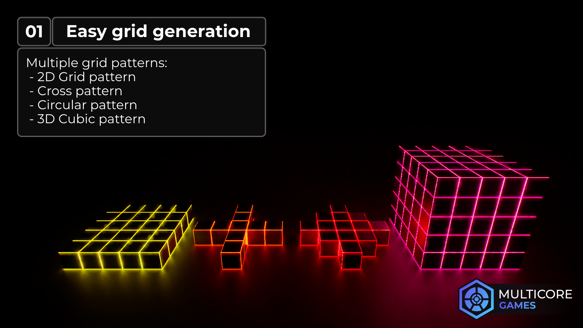 Automated Grid is a powerful and versatile toolkit for Unreal Engine that enables users to create and customize grids with a complex automated detection system. With this toolkit, you can easily generate grids of any size, mesh and materials, and adjust their properties such as grid pattern (2D Grid, Cross, Circular or 3D Grid/Cubic), length and offset.
