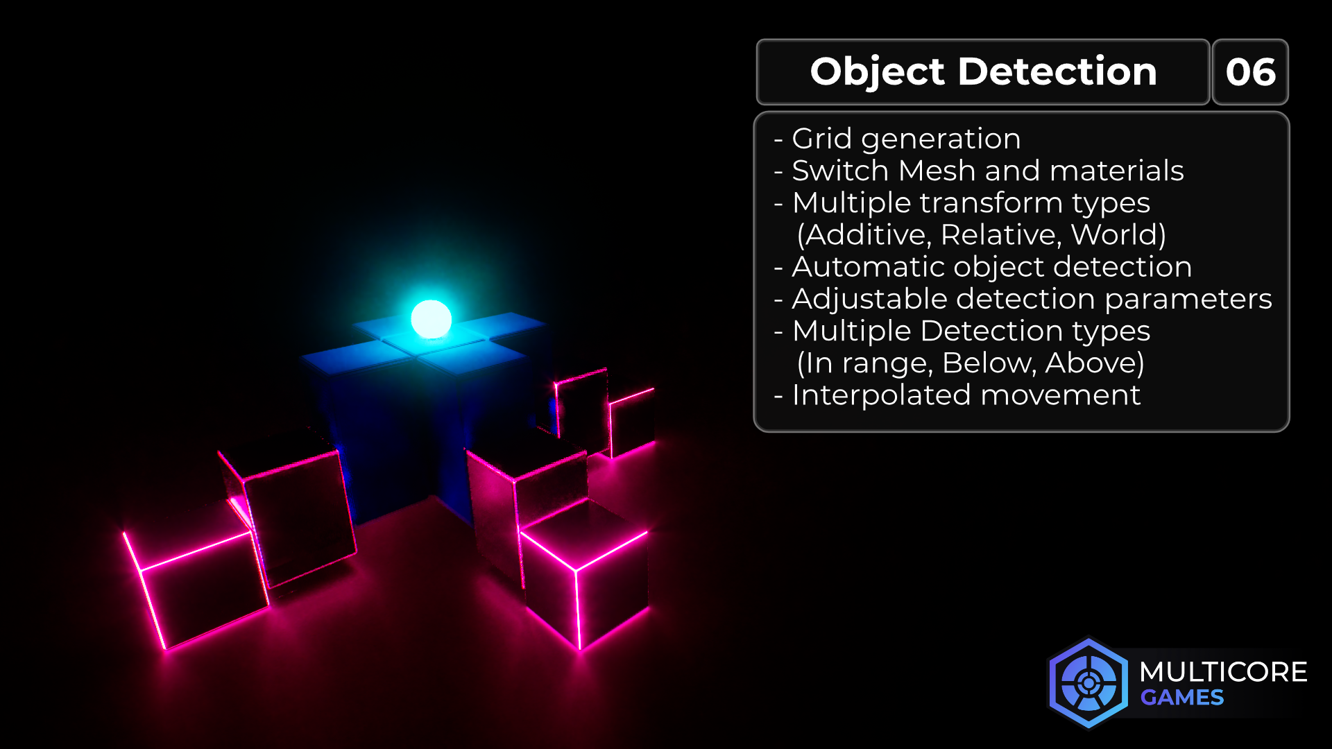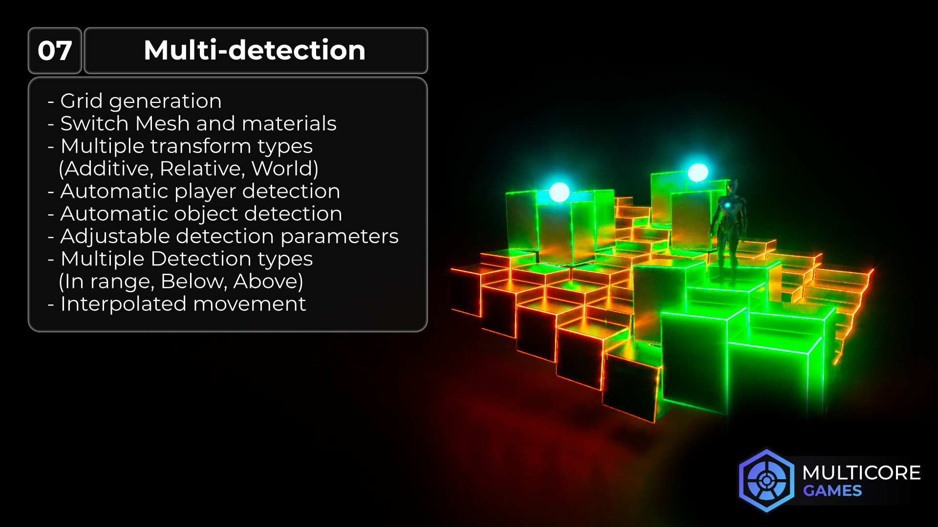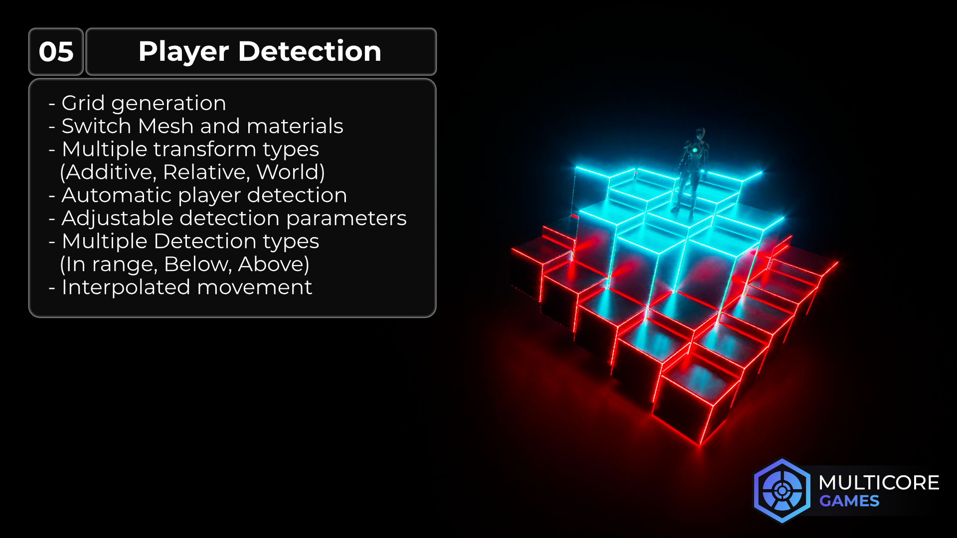Users can also enable the automated detection system, which allows the grids to interact with the player or multiple objects. The automated detection system has multiple detection types (In Range, Below, Above) and parameters (Detection Range, Detection Angle, Transform, Interpolation time).
