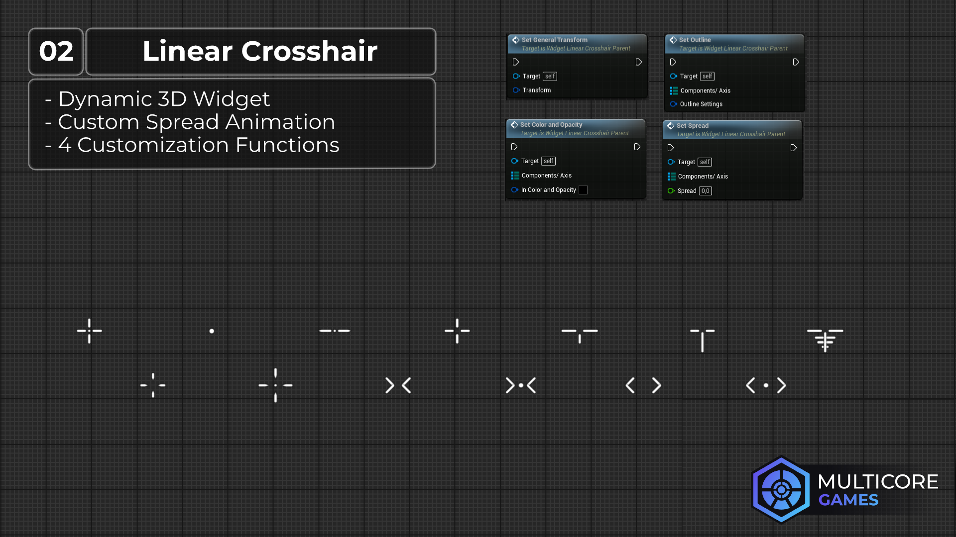 - Presets: This pack includes 17 Crosshair Presets + You can create your own preset as a child of the "Widget_Linear_Crosshair_Parent"