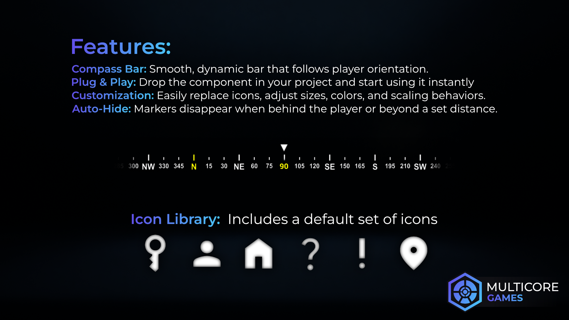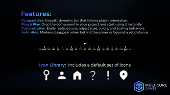The Dynamic Compass System is a lightweight and highly customizable solution for Unreal Engine projects that need an intuitive navigation system. Designed as a blueprint component, it automatically tracks objectives and displays markers on a sleek compass bar at the top of the screen.