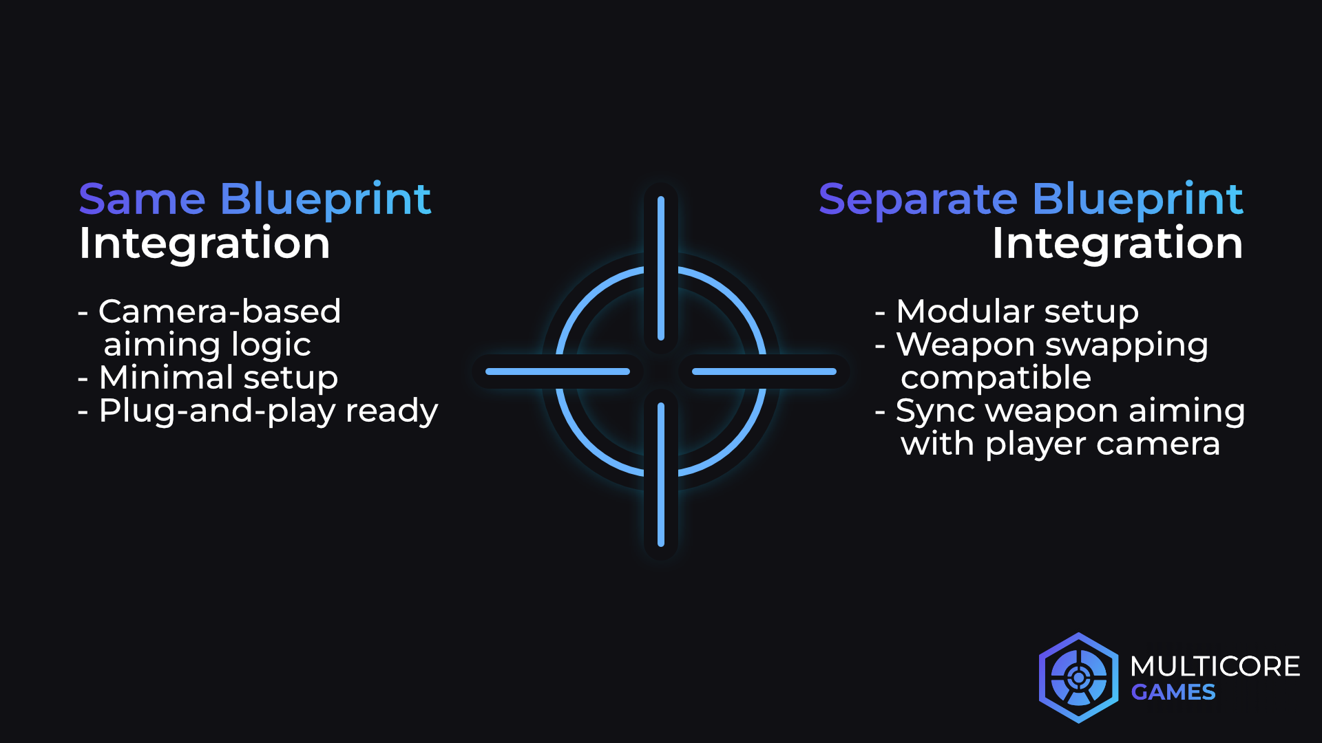 A camera-driven aiming solution for FPS games. Compatible with both integrated and modular weapon setups, it offers flexible and smooth aiming mechanics without relying on animation offsets.