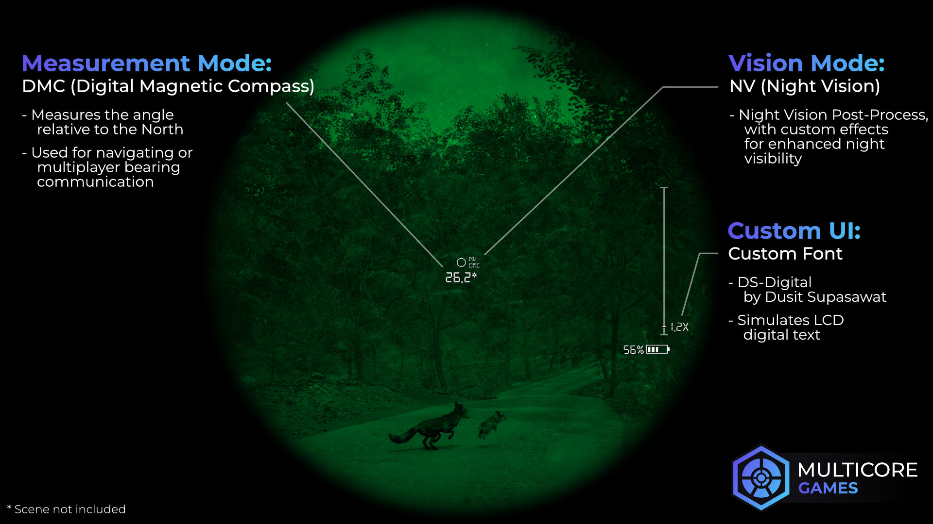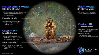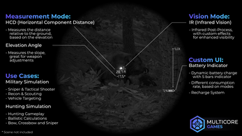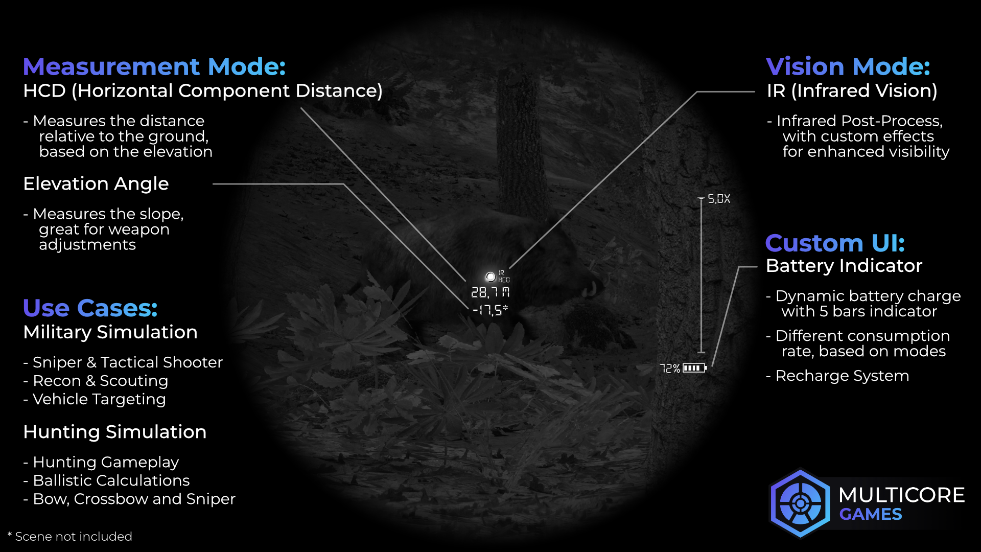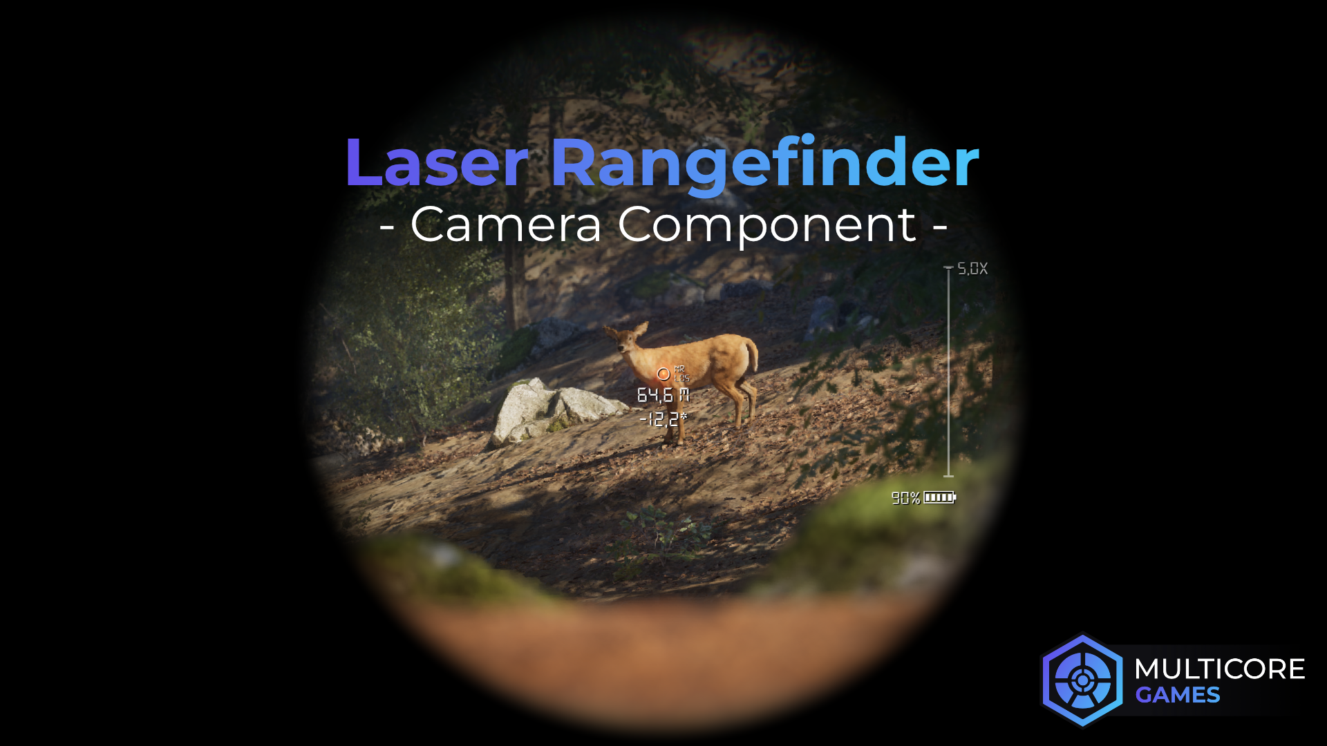 The Laser Rangefinder - Component is a modular, high-tech device blueprint ideal for sci-fi and tactical game environments. It features precise laser-based distance and angle measurements, multiple visual modes, and a fully integrated zoom and battery system, providing advanced targeting and situational awareness capabilities.
