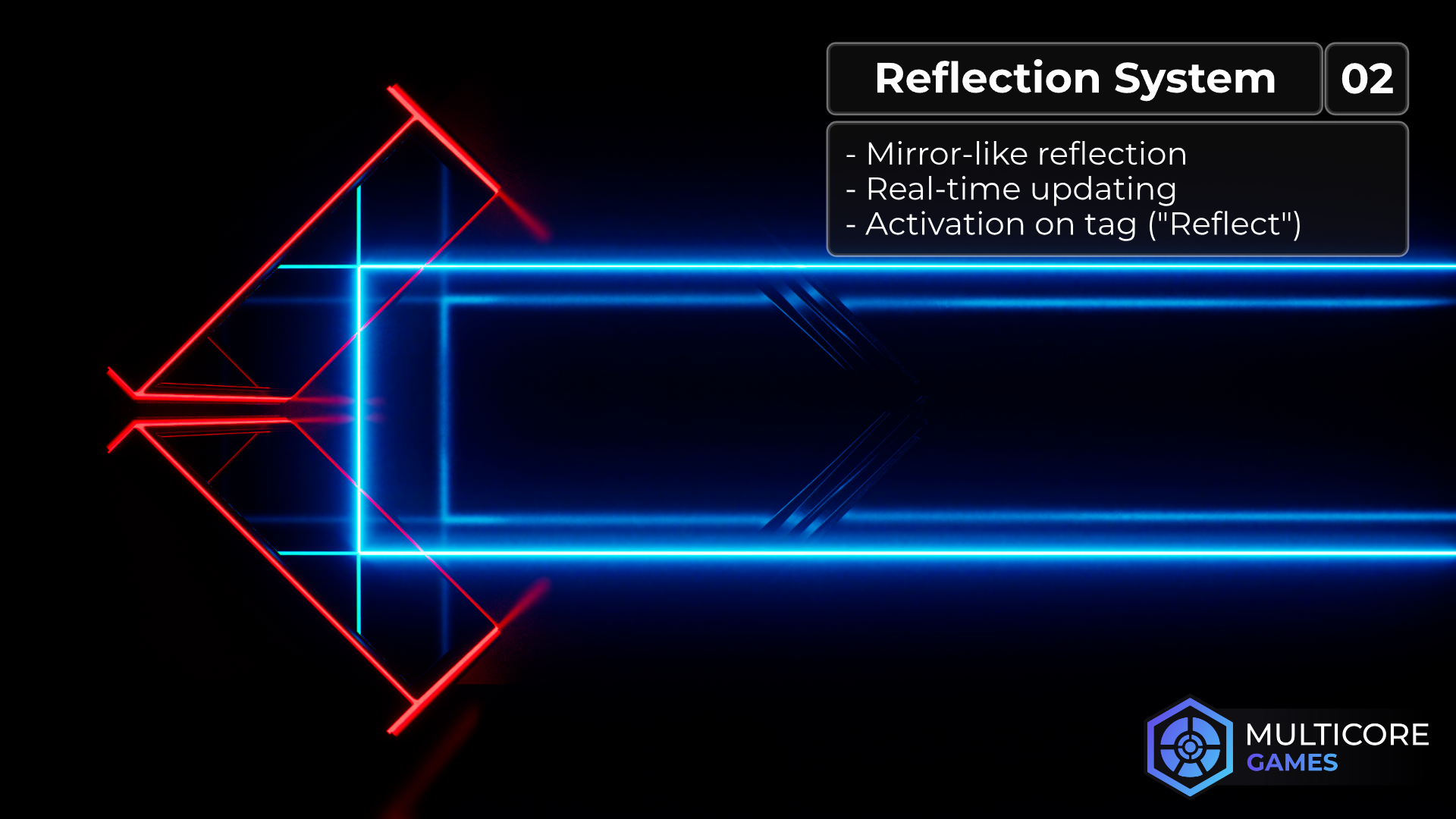 The Laser Reflection system acts like a mirror, bouncing the laser beam off the reflective surface at an angle opposite to the normal axis. Essentially, it follows the law of reflection, maintaining the incident angle relative to the surface normal. This ensures that the virtual lasers interact with the environment in a realistic and visually captivating way.