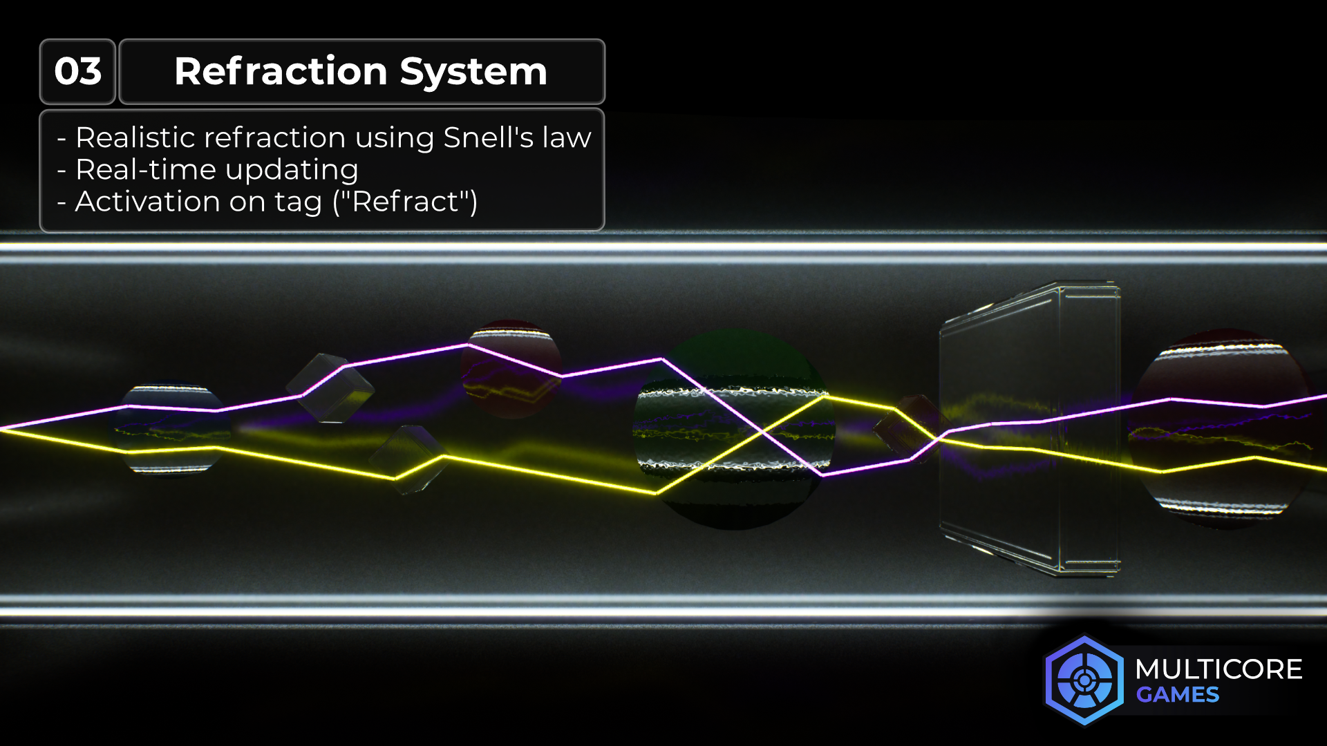 The Laser Refraction system simulates the refraction phenomenon. When a laser encounters a transparent or refractive medium, such as glass or water, it bends or changes direction. This phenomenon is governed by Snell’s Law, which relates the incident angle to the refracted angle. Essentially, the laser beam “bends” as it passes through the material, allowing virtual lasers to interact with their environment in a convincingly realistic and visually captivating manner.