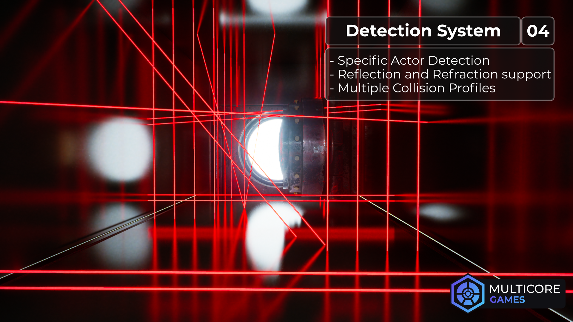 When any laser, originating from a parent source (Direct, Reflected or Refracted), detects an Actor, it triggers the Detection System.