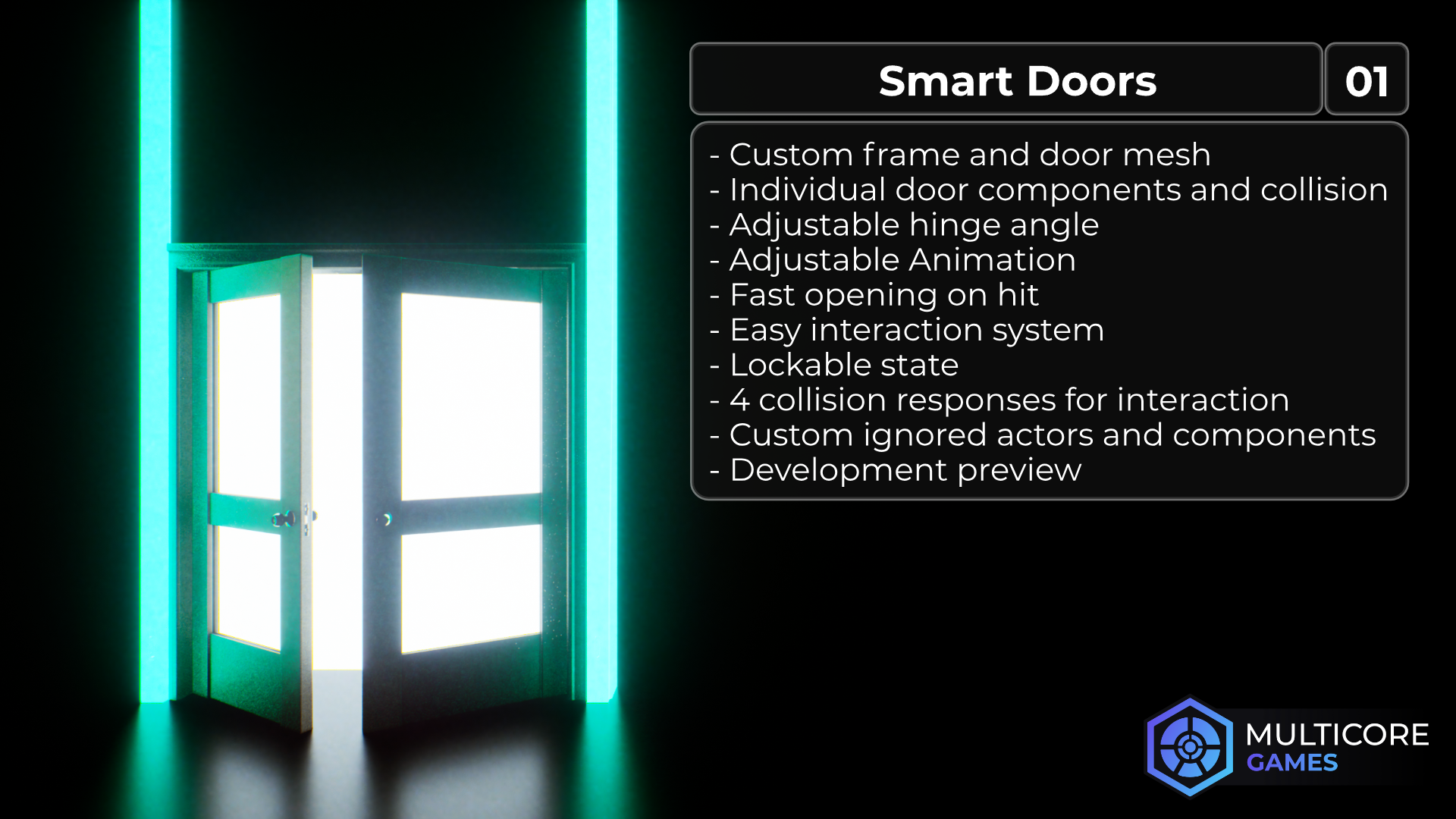 The Smart Doors feature in this package offers a highly customizable and interactive system for creating doors in your Unreal Engine projects.